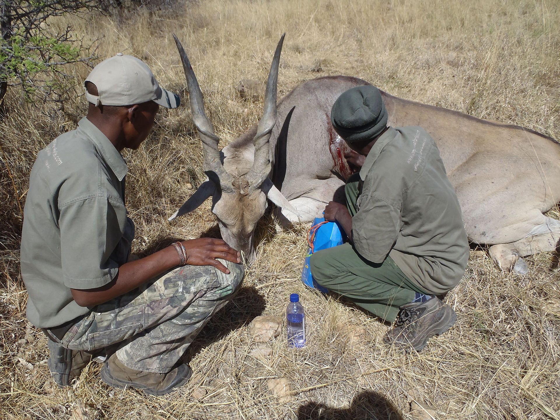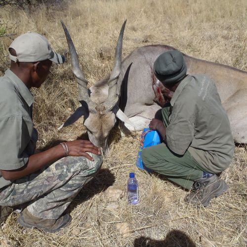 Jag fick sista dagen uppleva hans två första jakter som självständig guide! Detta gick utmärkt första försöket resulterade i en Timmes stalk och slutligen skott på en blue wildebeest! Andra försöket gick lugnt och sakta in i en hjord av samma djurslag och efter 30 minuter. Ca 50 meter i rätt vind lyckades vi hitta ett ungt hondjur bland alla tjurar!