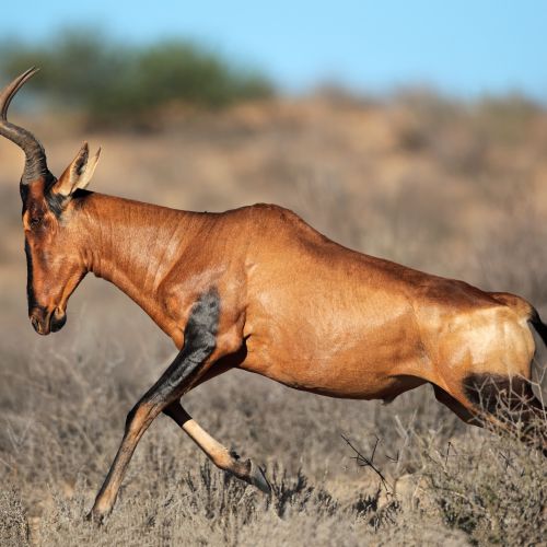 Vetenskapligt namn: Alcelaphus b caama Underarter: Är själv en underart till Alcelaphus buselaphus Utbredning: Sydafrika, Namibia, Botswana och Angola. Habitat: Öppen bush och grässlätter. Beskrivning: Mellanstor antilop som väger ca 170 kg och mäter 120 till 140 cm i mankhöjd. Skinnet är rödbrunt. Hornen är svarta och börjar i en...