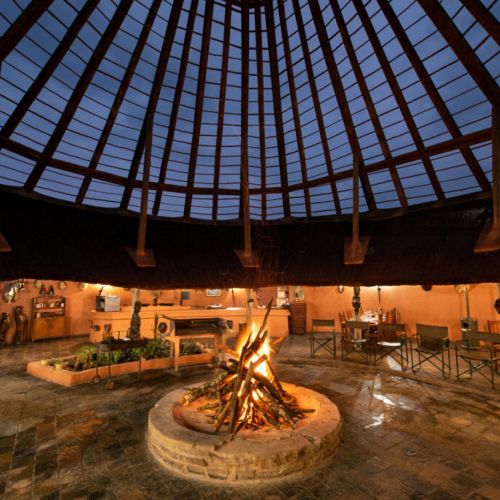 Campen ligger vackert med utsikt över bushen där man blir inkvarterad i rymmliga bungalows byggda av sten från bushen med bad och toalett. Det är 16 bungalows i allt så stället är också byggt till att kunna ta stora grupper. Det är också en swimmingpool om man behöver kylas ner. Måltiderna serveras antingen i den gemensamma lodgen...