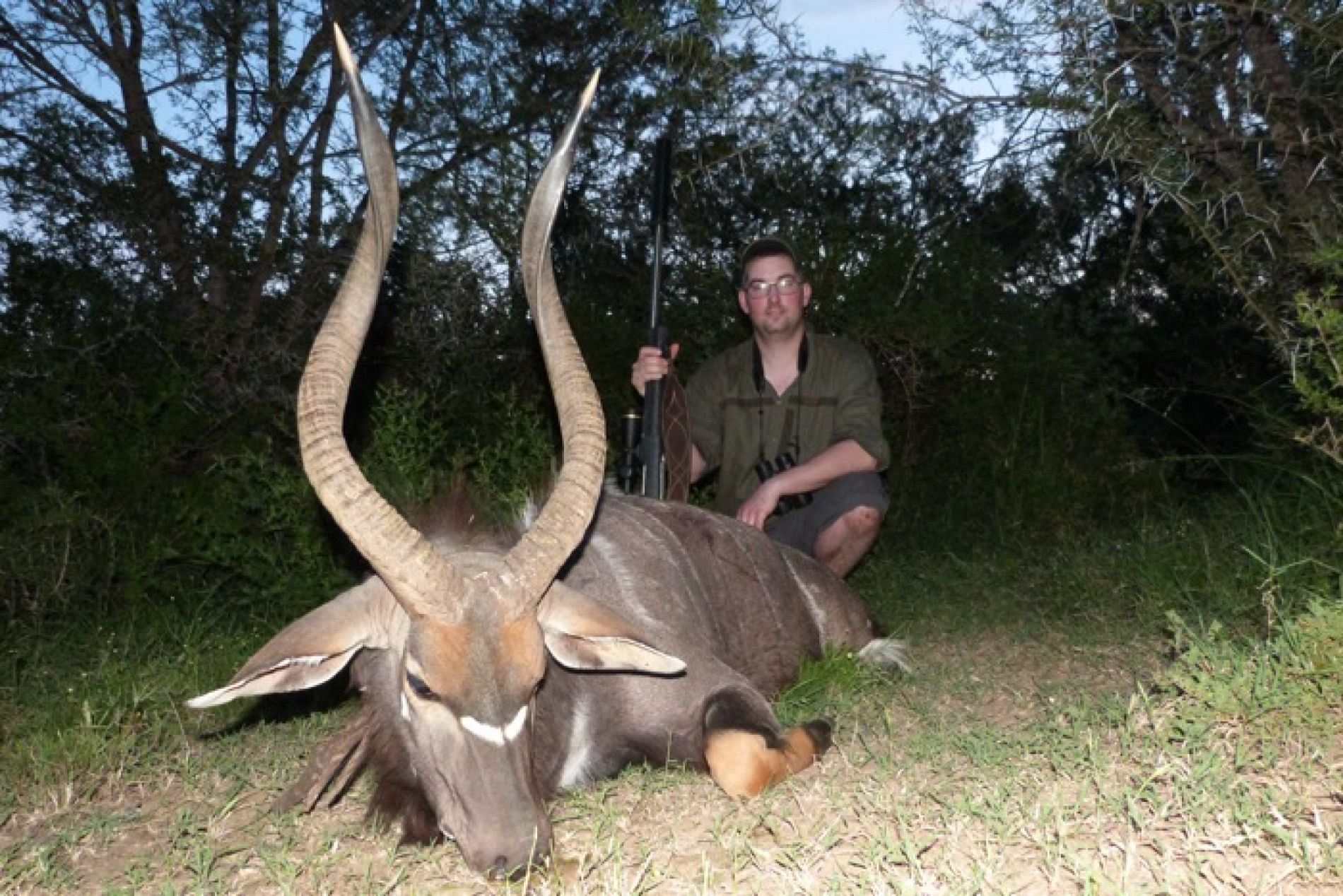 Sekundet senere så jeg den flygtende nyala gennem tæt krat på cirka 30 meters afstand og han så mig! Med et kraftfuldt spring satte han af til siden og løb nu i fuldt firspring væk fra floden med siden til mig. Jeg havde instinktivt kastet riflen til kinden, afsikret den og fulgte nu den springende tyr gennem buskene. Jeg var gået på automatpilot i drivjagt-mode! Lidt længere fremme øjnede jeg en åbning mellem træerne. Da tyren passerede, var min pegefinger tilfreds med inputtet fra kikkerten. Skuddet bragede og ramte nyalaen midt i et spring præcis der, hvor halsen sidder fast på rygraden.