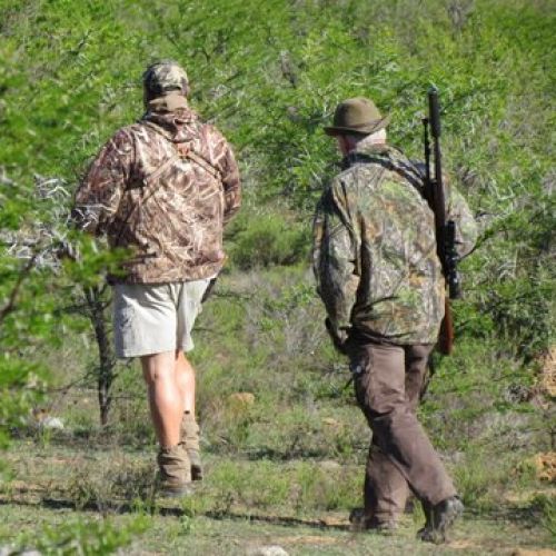 Vi indledte vor første jagtdag med en lang gåtur langs Nzehelelefloden – en biflod til den mægtige Limpopoflod, der udgør revirets – og Sydafrikas – grænse til nabolandet Zimbabwe. Landskabet er vildt og imponerende. Det samme er vildtbestandene. Langs den dybe og stenede flodseng så vi masser af waterbuck, bushbuck, kudu, nyala og bush pig. Store krokodiller patruljerede det lave vand og en gnaven gammel sort næsehornstyr lagde konstant beslag på vor fulde opmærksomhed.