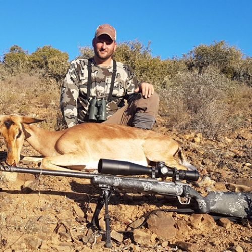 Jeg jagede atter med min Mauser M03 i .300 Winchester Magnum med en Zeiss Victory HT 2.5-10X50 på toppen. Helt sikkert for meget energi til et dyr som kun vejer omkring 12 kg. men til nyalaen var kaliberet ganske passende og jeg måtte blot være omhyggelig med at placere mit skud bag skulderen på duikeren, så ville de bondede Norma Oryxkugler formentlig være ganske varsomme.