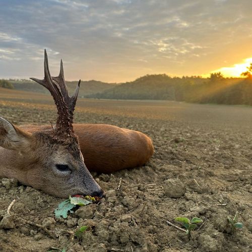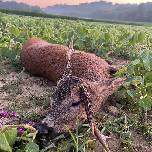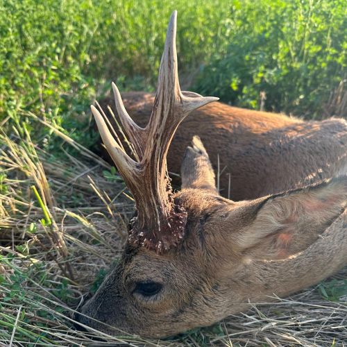 På kanten af kornmarken skød skoven ud i marken, nærmest som en tange. Dette sted blev vores “stand” med udsigt mod øst. Solen var lige gået ned. Da Lucas første gang afsøgte majsmarken med kikkerten, blev han ret tændt og satte hurtigt skydestokken op. I mellemtiden kunne jeg også se bukken. Dyret befandt sig mellem nogle majsrækker. Jeg kunne ikke se dens krop, men der var masser af opsats, der stak op. Jeg satte riflen i skydestokken og sagde til Lucas; "OK. Få ham op.". Lucas råbte. Intet skete. Han råbte igen og højere. Bukkens ører bevægede sig. Lucas råbte nu virkelig meget højt og så var der bevægelse. Jeg vidste af erfaring, at selv hvor atletisk, yndefuldt og hurtigt et rådyr er, så rejser det sig ikke hastigt op fra søvn. Først kom dyret på forben, så oprejst, hvorefter den strakte sig. Denne gang var lykkens gudinde med mig. Bukken stod op. Skuddet var velplaceret, og dyret var nede.