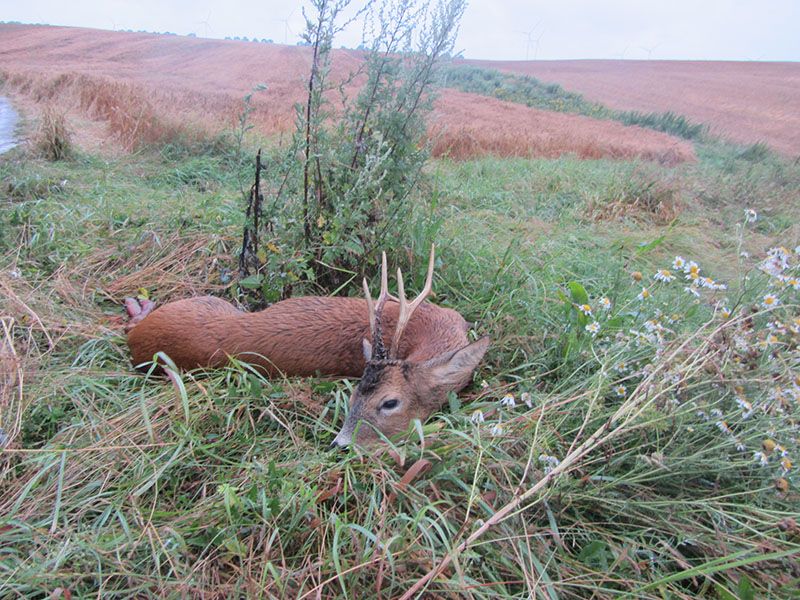Så blev det tirsdag morgen kl. 04.00, Milec holdte trofast og ventede på mig.. Min allersidste jagttur i Polen for denne gang, kunne mine sarte nerver overhovedet holde til flere jagteventyr ? Vi kom op i tårnet fra i aftes, og ventede, den time gik lynhurtigt, føltes som 5 minutter.. Intet vildt overhovedet.. Jeg kom slukøret ned i bilen, nu skulle vi jo ud og skyde min sidste pjevse buk !! Ja ved godt jeg var en utaknemlig satan, men sådan var sindstilstanden nu på daværende tidspunkt.. Vi trillede ud af markvejen i den store 4 x 4.... Pludselig satan og helvede om han ikke gik ude på marken langt til højre selveste Gazellen med retning imod majsmarken vi lige var kørt forbi... Vi fløj ud af bilen, kunne ikke tro det, listede ca. 50 meter op i majsen og stillede os ud på marken lige i kanten.. Han kom sgu trissende lige så stille ud af marken, stod stille 100 meter foran mig til et perfekt sideskud... Jeg stod med riflen i skydestokken, schiesen, schicen, schisen, nærmeste råbte Milec.