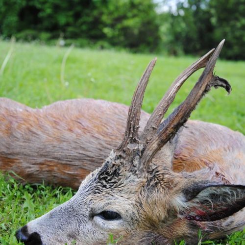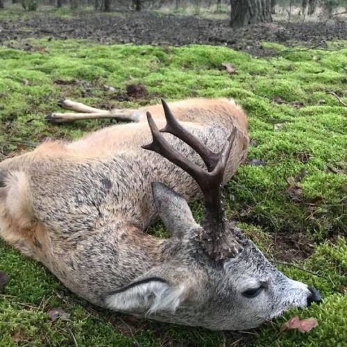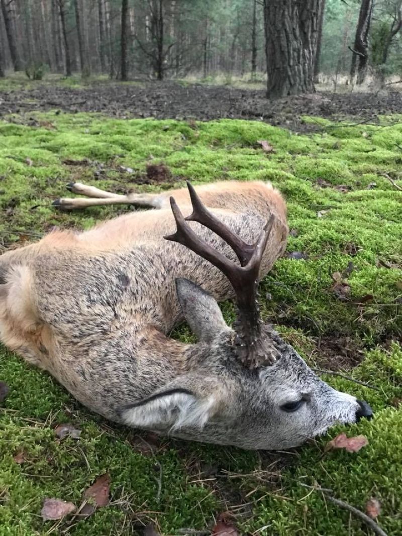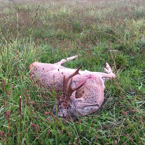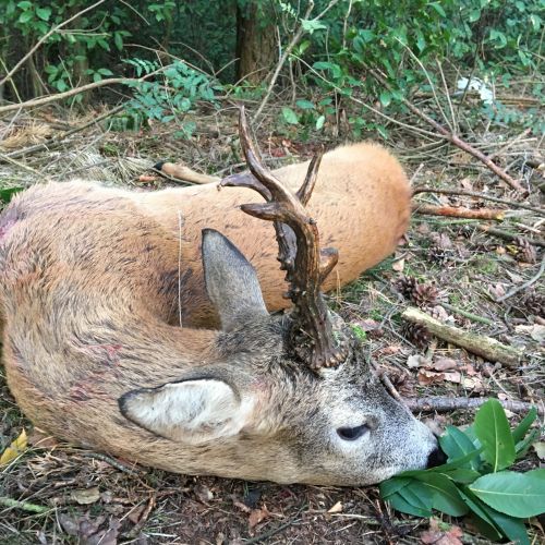 Fra træerne foran os kom en rå ud og gik og essede. Den havde et meget stort yver, så den havde formentlig lagt lammene af inde i træerne. Pludselig blev den lidt urolig og kiggede til vores venstre side. Der kom en buk ud fra hegnet. Den kom lidt ud på marken og vendte siden til. Da jeg skød sprang den højt i vejret og løb et stykke hvorefter den forsøgte at vende, men faldt om.
