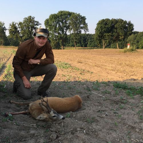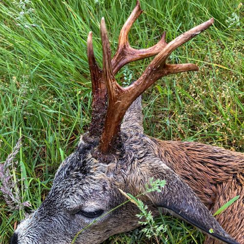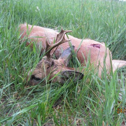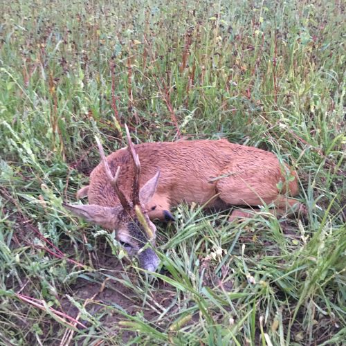 30.05. Efter en kop te var der afgang i terrænet kl 04,00. Mathæus kørte ud i et landbrugsområde med små marker og lidt hegn. Her blev bilen parkeret og vi gik lidt rundt. To smaldyr fjantede rundt. Lidt efter blev de efterfulgt af en spidsbuk. Med tanke på min forbier fra aftenen i forvejen prøvede vi, om vi kunne komme til skud på bukken. Det lykkedes, og den faldt perfekt for kuglen. Afstanden var ca. 100 m og dermed betydelig længere end ved forbi skuddet