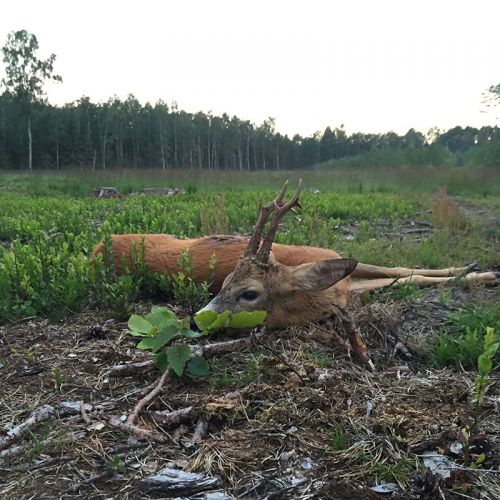 Ca. 800 meter ude gik en rå og essede, og ca. 100 m foran os gik et lille smaldyr og essede. Senere kom to søer med frislinge til syne ved skoven foran os. Der var en helt hvid frisling iblandt. En ræv musede rundt på engen, men jeg kunne ikke få et ordentligt billede af den. Pludselig blev der uro under tårnet, og et stykke råvildt løb smælende ind i skoven. Vi valgte derfor at forlade tårnet og forsøge et andet sted. Vi kørte et lille stykke og parkerede bilen hvorefter vi gik frem til en skoveng. Her gik en fin buk. Desværre skød jeg forbi til den. Den blev forskrækket og smælede da den løb ind i skoven. Vi prøvede at finde tegn på anskydning, men fandt intet. Herefter kørte vi hjem. Efter lidt mad var det sengetid.