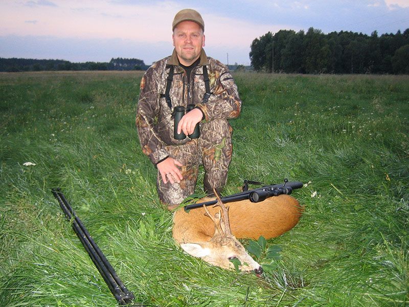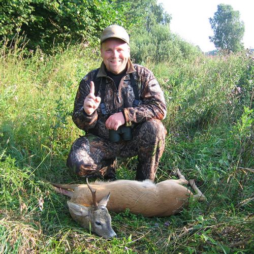 Afgang kl 04,00. Kørte til flere forskellige områder og forsøgte at komme til et par bukke, men de var for små. Prøvede et sted, hvor vi havde været tidligere, og her var gevinst. En pæn buk var ude på engen, og skydestokken blev stillet op. I skuddet gav bukken et hop, men gik roligt fra stedet og stoppede bag en busk, så jeg kunne ikke komme til at skyde igen. Bukken forsvandt. Vi ledte længe efter schweiss eller andre tegn på en anskydning, men fandt intet. Da det blev stå-op-tid for almindelige mennesker sendte vi bud efter Robert, der kom med en schweisshund. Efter nogen tid måtte Robert meddele, at hunden ikke kune finde noget at gå efter og at jeg formentlig havde skudt under bukken og (heldigvis) ikke havde skadet den. Herefter kørte vi hjem til morgenmaden og formiddagsluren. Efter frokosten kørte vi igen en tur rundt i omegnen. Kl. 18,00 var der atter afgang til terrænet. Bilen blev parkeret og vi gik mod en skoveng. Pludselig kom bukken springende ind i skoven, hvor den smælende fortalte, at den havde set os. Mathæus ærgrede sig tydeligvis. Vi fortsatte dog ud til engen, og Mathæus søgte med kikkerten, men fandt intet. Pludselig fik vi øje på en ræv der gik og musede tæt ved os. Jeg nåede ikke at fotografere den før den var væk. Herefter gik vi tilbage til bilen og kørte lille stykke til endnu en lille skoveng. Her opdagede Mathæus hurtigt en buk. Jeg kunne godt se. at det ikke var verdens største buk, men eftersom jeg tilsyneladende ikke kunne ramme de store, måtte jeg træde et skridt nedad og skyde de lidt mindre. Så da skydestokken var blevet stillet op, og jeg havde flyttet den nogle gange fik jeg et frit skudfelt, og leverede bukken med en høj kugle.