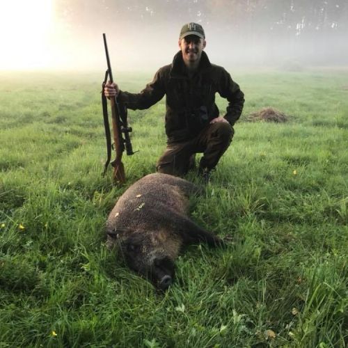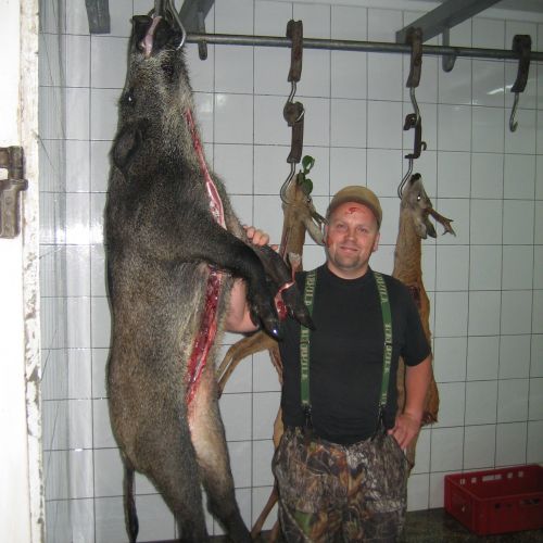 Min kvote for bukke var nu fyldt, og jeg spurgte om der var mulighed for at skyde en gris hvortil Mathæus svarede, at der var en mulighed hvorefter vi kørte et lille stykke og parkerede bilen. Vi gik meget forsigtigt frem ad en skovvej, hvor der på begge sider var tydelige tegn på aktivitet fra vildsvin. Da vi kom frem til en mark, gik der en so med 8-10 smågrise. Inden vi rigtig havde besluttet hvad vi ville, kom en überläufer ud fra skoven. Jeg spurgte om jeg måtte skyde den, og fik lov. Her gav jeg mig rigtig god tid, og da skuddet gik, sank den sammen hvor den stod.