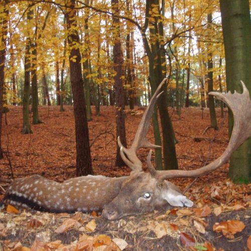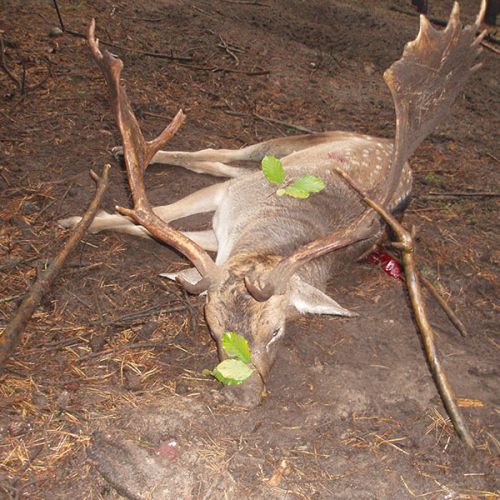 Der stod vi så de næste 3 kvarter for at udvælge en hjort, og til sidst faldt valget på en jeg også kunne acceptere, den så meget stor ud i mine øjne, jeg havde riflen i anslag og afsikret 3-4 gange før den stod fri af træer og ikke mindst andre dyr, det var meget, meget spændende. Den var meget stor på den ene stang og lidt mindre på den anden, men som sagt så den meget stor ud i mine øjne, og Peter mente den var 3,3 – 3,5 kg. og det var jo noget i den retning jeg gik efter, så jeg lod kuglen gå (8x57) og den gik max. 10 m. og faldt omkuld. Og i løbet af ingen tid var pladsen rydtet for dyr. Vi ventede et øjeblik og gik så hen til hjorten som var stendød. Kuglen sad godt og jeg fik overrakt den sædvanlige gren med blod og så videre.