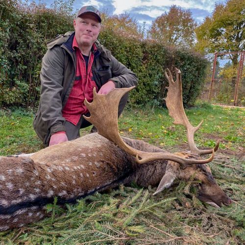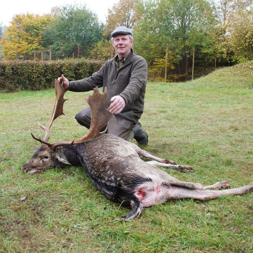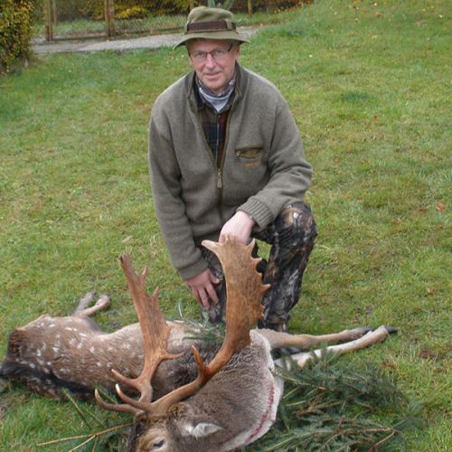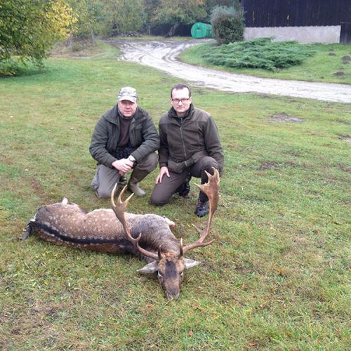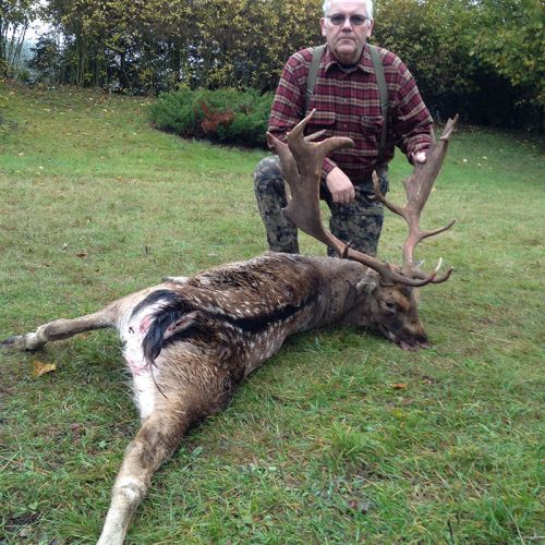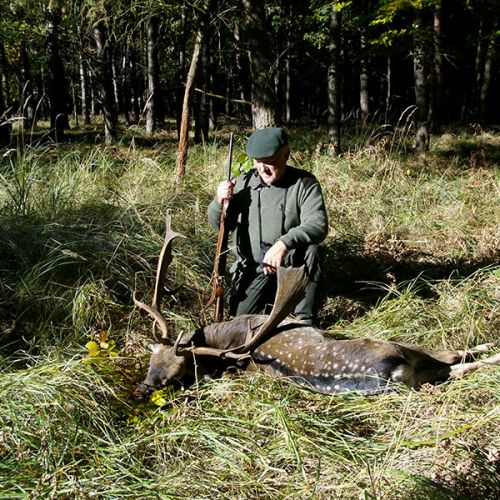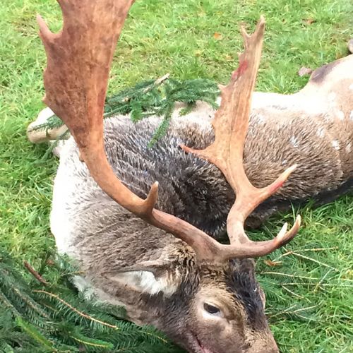 Min jagtfører stod og vurderet hjorten, og til sidst fik jeg tegnet – den er selektiv, og perfekt til afskydning. Pürchen blev sat i gang – Hjorten var gået igennem nogle træer, og havde kursen mod et åbent stykke eng. Vi pürschede os ind på 70 meter, og spændingen steg, hjertet bankede hurtigere – feberen havde meldt sin ankomst – men hjorten stod perfekt med bredsiden til, så det var en skuddet skulle falde, inden den fik færten af os. Hjorten blev ramt med en perfektbladkugle, men kæmpede en kamp for at forsætte, så den fik endnu en kugle og faldt efter denne. Feberen forsatte efter denne fantastiske pürch med et fantastik resultat, og benene rystede, så der skulle gå fem minutter, før vi kunne komme hen og se hjorten. En fantastisk hjort ventede os – en fuldstændig regelmæssig 10-ender på 6,3 kilo var forendt, og en lykkelig og glad jæger stod ved siden af, og nød oplevelsen til fulde.