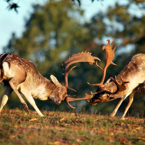 Djupa grymt spräcker stillheten i den färgsprakande höstliga skogen. Kapitala dovhjortar är i kamp om hindarnas gunst. Luften vibrerar av spänning…