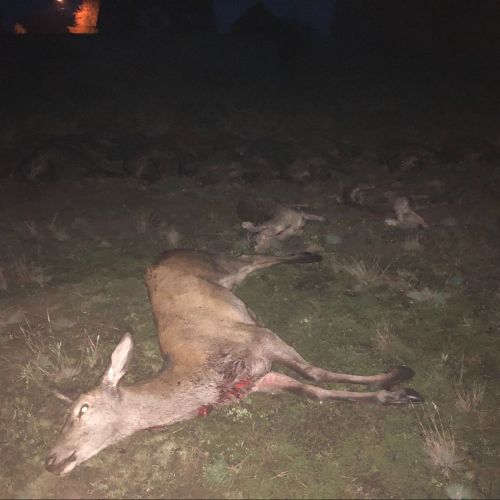Om aften kørte vi alle 3 ud, hvor vi startede med at sidde i en lille times tid. Derefter kørte vi videre til et sted hvor han mente der ville være hjorte. Vi gik et lille stykke tid inden vi hørte hjortene brøle og da vi begyndt at pürch på dem sprang der pludselig en hind og en kalv ud ca. 10 meter foran os. Vi gik lidt mere og kom ned hvor der stod nogle højspændingsmaster hvor de havde knust et spor. Lidt længere fremme stod der 2 store hjorter + hinder, kalve og bi hjorter. Jeg (ledsager) blev sat af på en skovvej, mens guide og jeg (jæger) gik videre for at pürch på hjortene da vi kom lidt længere ned stod der 1 hjort ude på ca. 170 meter, som guiden mente jeg skulle skyde på, men det blev for mørkt og begyndte at småregne og dyrene trak ind i skoven igen, så vi besluttede at kører tilbage.
