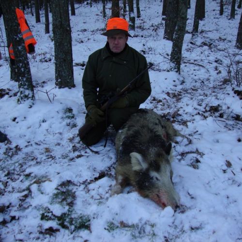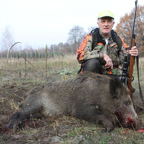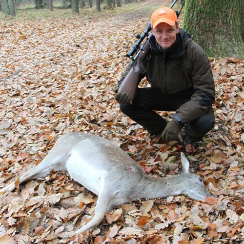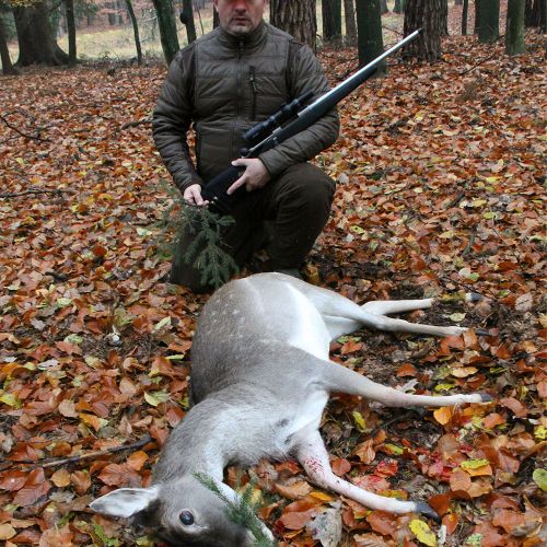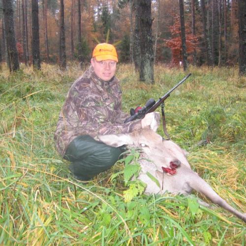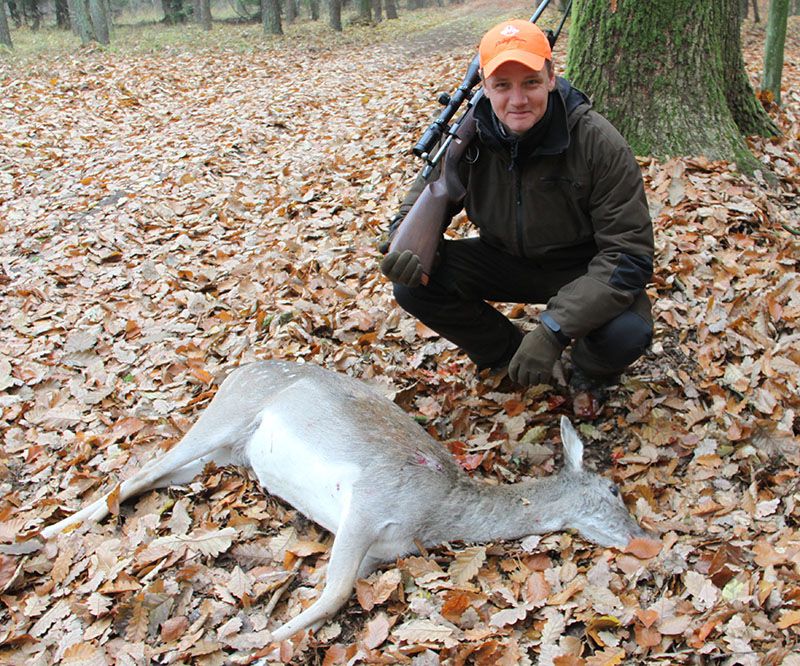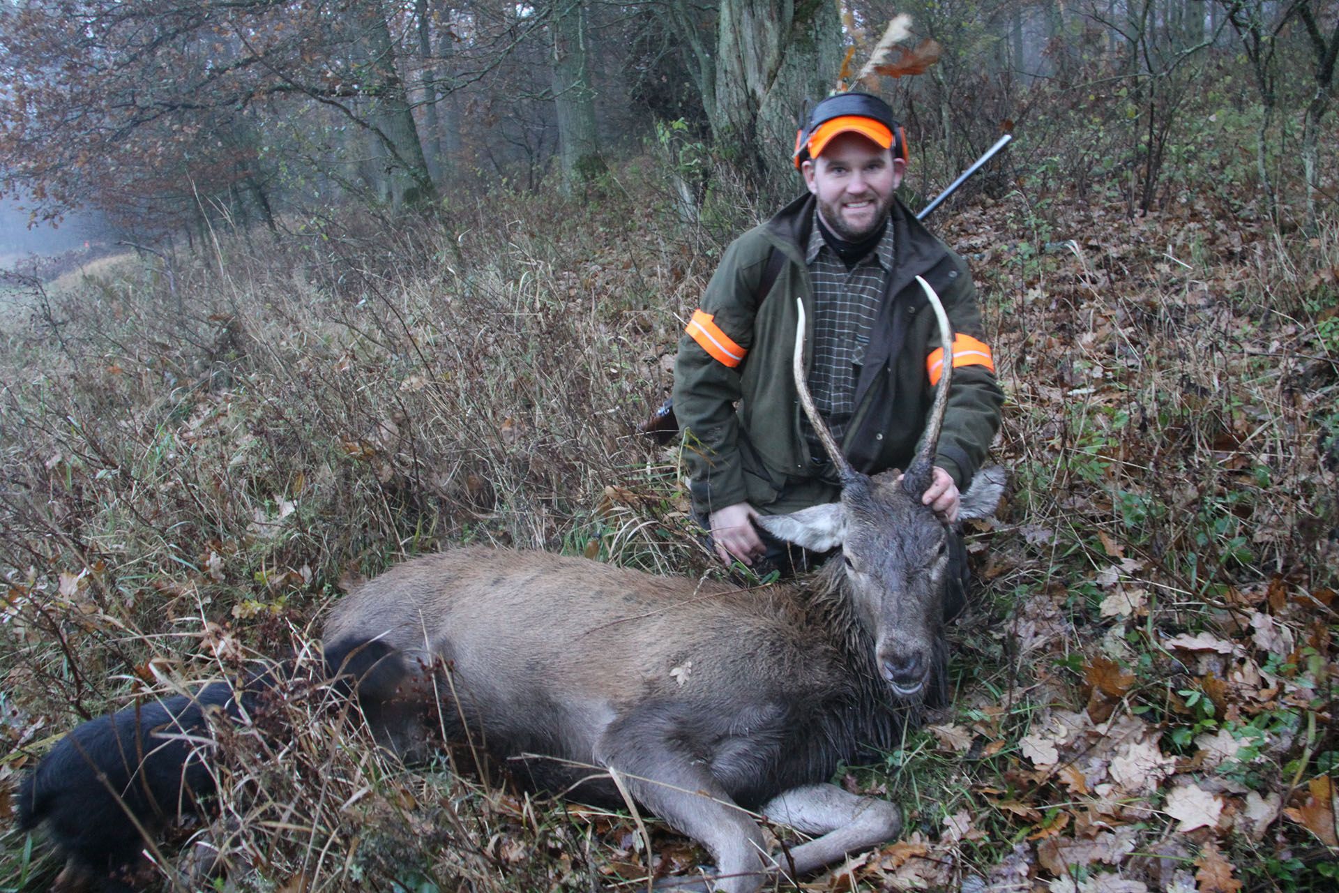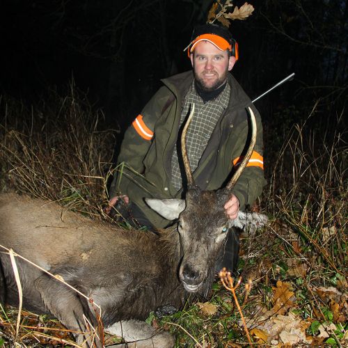 Grzegorz kørte os ud i skoven, men det første stop på turen havde han åbenbart ikke megen tiltro til så vi drog hurtigt videre. Ved næste stop stiller vi bilen og pürscher videre ned af en skovvej. Efter 4-500 meter nærmer vi os en stor eng, og gennem nogle lave elletræer spotter jeg et par dåer, der går på engen. Kort tid efter kommer hjorten frem. Scenen er som taget ud af en jagtfilm. Brunsten er i fuld gang, og hjorten går gryntende rundt og forsøger at holde styr på dåerne. Grzegorz siger OK til hjorten – vi har allerede talt om, hvilken størrelse trofæ jeg ønsker. Jeg pürscher selv frem og da jeg er inde på 120 meter tør jeg ikke fortsætte. Jeg finder et hul mellem elletræerne, og da hjorten efter kort tid vender siden til kan jeg give den en kugle, der er øjeblikkeligt dræbende. 40 minutters pürsch så havde jeg fået den hjort, som jeg havde drømt om. En hjort på knapt 3 kilo.