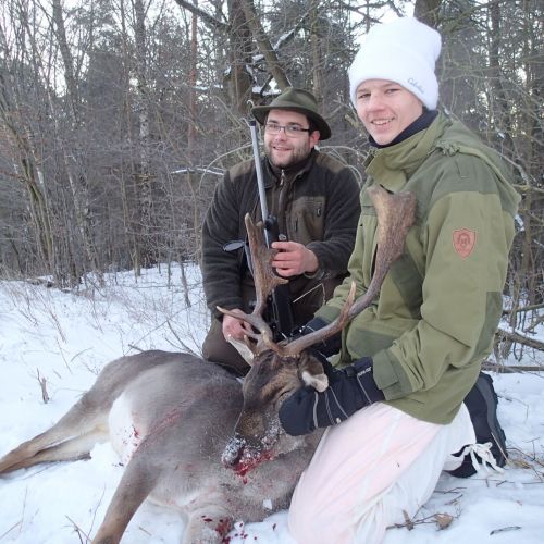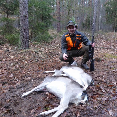 Gamekeeperen spørger om jeg vil skyde den, selv om den er skadet (har kun en stang) og ja selvfølgelig vil jeg det. Hjorten kommer nærmere på grund af den 10 ender der står 20-30 meter fra os og brøler. Da han træder ud af tågen lader jeg skuddet gå, hjorten springer og løber 10-20 meter og vælter død om. Alt dette er min svigerfar vidne til på hans første pürch en oplevelse både for mig, men også ham. Hjorten vejede 5,3 kg – utroligt med kun 1 stang! Om aftenen skød jeg en ræv. Hvis svigerfar havde været lidt yngre, er jeg sikker på han havde taget jagttegn efter denne tur. Vi har haft store natur oplevelser på turen og set rigtig meget vildt. God jagt, godt ophold, god forplejning.