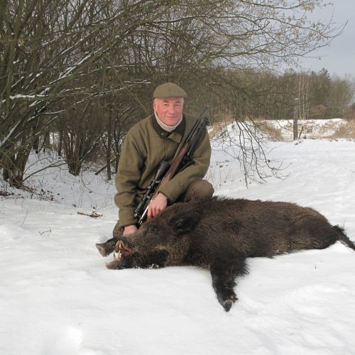 Min jagtfører stod og vurderet hjorten, og til sidst fik jeg tegnet – den er selektiv, og perfekt til afskydning. Pürchen blev sat i gang – Hjorten var gået igennem nogle træer, og havde kursen mod et åbent stykke eng. Vi pürschede os ind på 70 meter, og spændingen steg, hjertet bankede hurtigere – feberen havde meldt sin ankomst – men hjorten stod perfekt med bredsiden til, så det var en skuddet skulle falde, inden den fik færten af os. Hjorten blev ramt med en perfektbladkugle, men kæmpede en kamp for at forsætte, så den fik endnu en kugle og faldt efter denne. Feberen forsatte efter denne fantastiske pürch med et fantastik resultat, og benene rystede, så der skulle gå fem minutter, før vi kunne komme hen og se hjorten. En fantastisk hjort ventede os – en fuldstændig regelmæssig 10-ender på 6,3 kilo var forendt, og en lykkelig og glad jæger stod ved siden af, og nød oplevelsen til fulde.
