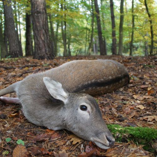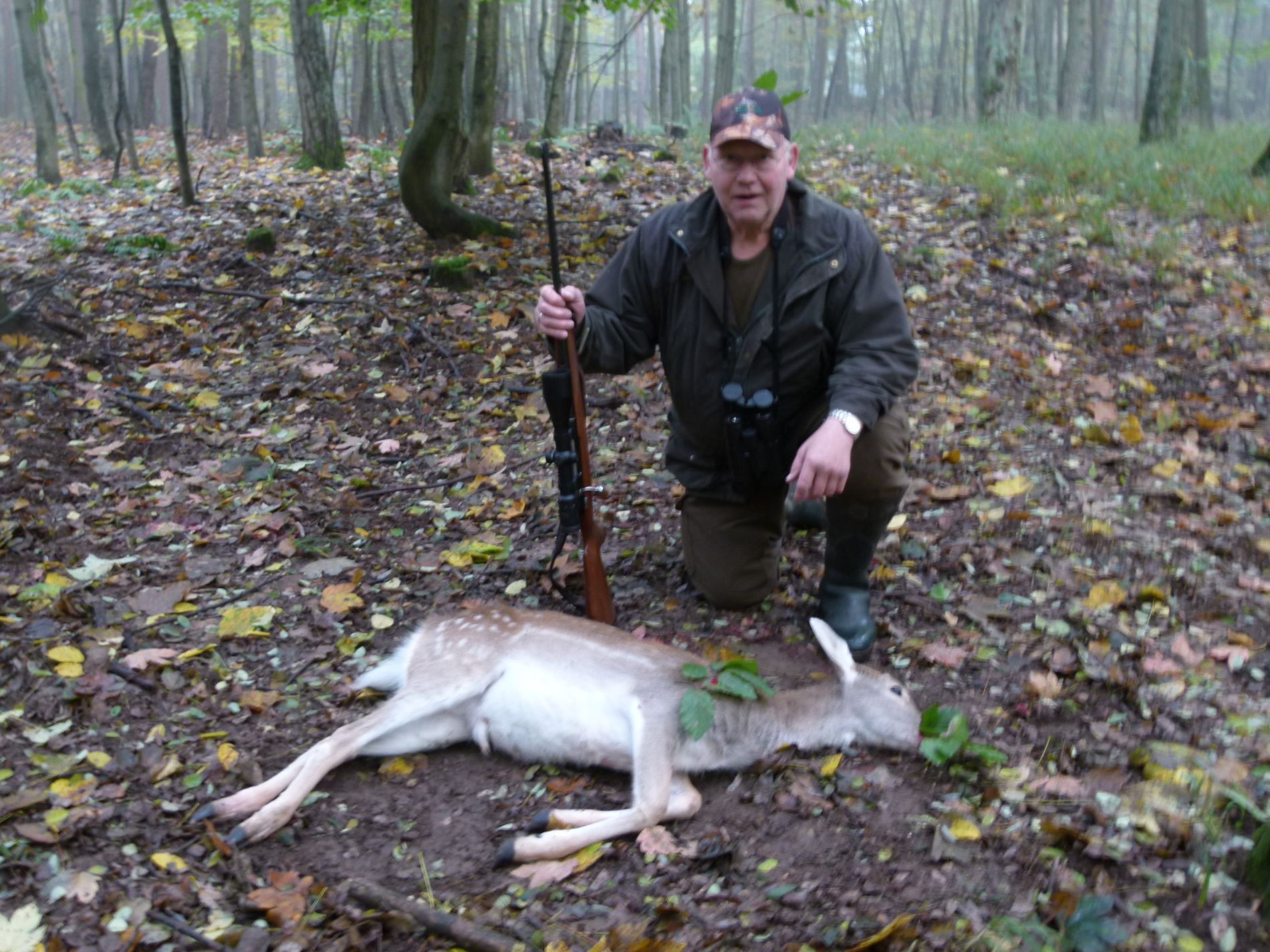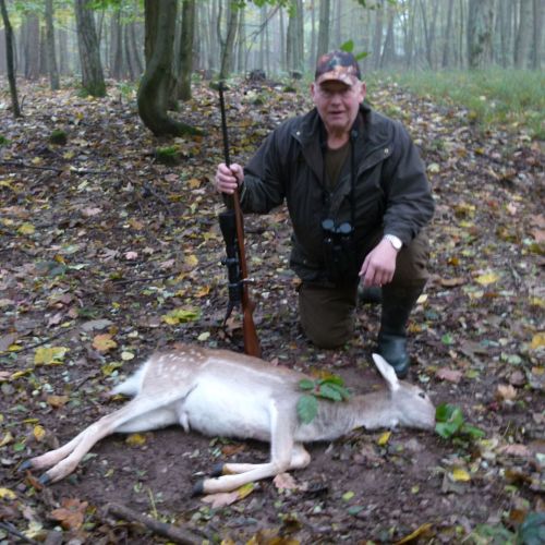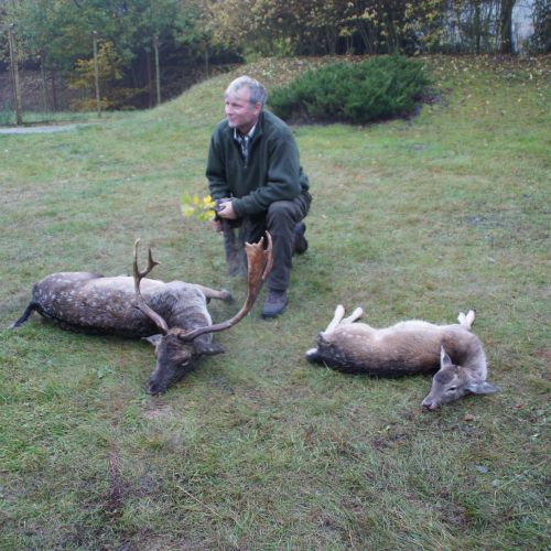Der stod vi så de næste 3 kvarter for at udvælge en hjort, og til sidst faldt valget på en jeg også kunne acceptere, den så meget stor ud i mine øjne, jeg havde riflen i anslag og afsikret 3-4 gange før den stod fri af træer og ikke mindst andre dyr, det var meget, meget spændende. Den var meget stor på den ene stang og lidt mindre på den anden, men som sagt så den meget stor ud i mine øjne, og Peter mente den var 3,3 – 3,5 kg. og det var jo noget i den retning jeg gik efter, så jeg lod kuglen gå (8x57) og den gik max. 10 m. og faldt omkuld. Og i løbet af ingen tid var pladsen rydtet for dyr. Vi ventede et øjeblik og gik så hen til hjorten som var stendød. Kuglen sad godt og jeg fik overrakt den sædvanlige gren med blod og så videre.