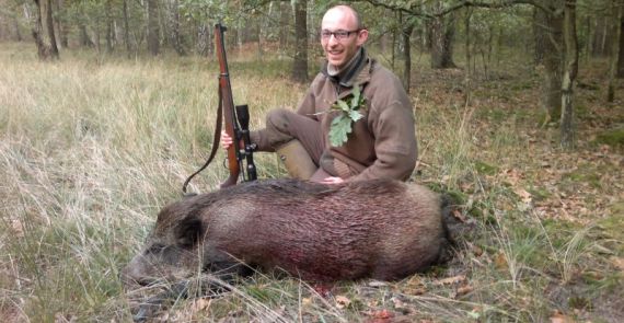 Jeg ærgrede mig da turen fortsatte, det ville have været dejligt, hvis det kunne lykkedes med et vildsvin. Vi kom kun til at køre i meget kort tid, inden der kom en flok svin ud på vejen foran bilen. Vejen var helt lige på dette stykke og gik tværs over en lavning. Svinene kom på den anden side af lavningen og var på vej ned i denne. Afstanden vil jeg vurdere til at have været omkring 250 meter. Da svinene kom lige imod os på vejen, var der rigeligt tid til at komme ud af bilen og få skydestokken op. Jeg fandt dyrene i riffelkikkerten, men med soen forrest, og alle grisene lige bag hende kunne jeg ikke skyde. Pludseligt drejede soen af ind i skoven, og grisene kom fri. Da den sidste gris skulle til at dreje efter dens artsfæller, løsnede jeg skuddet. Afstanden var på det tidspunkt kommet ned på Ca. 120 meter, og jeg var så sikker på at skuddet skulle sidde der, at det kom som en overraskelse at grisen ikke klappede sammen.