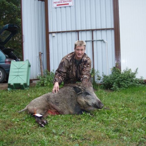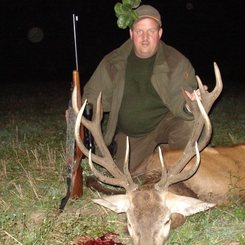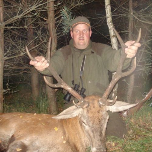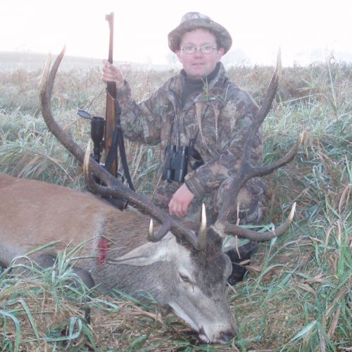 Jeg brugte min ekstra tid på at prøve at skyde en kronhjort, sådan som jeg har prøvet det mange af de andre år i Dabrowa uden held. Denne gang lykkedes det. Arek og jeg var på vej i hochsitz sidst på eftermiddagen den anden dag dernede. Jeg havde kort forinden været så heldig at skyde den første af dåhjortene. På vej mod hochsitzen ser vi 2 kronhinder så i kanten af et skovområde. De var urolige og anede tydeligvis, at noget var galt. De lister stille og roligt ud på midten af engen og inde fra skovområder får de følgeskab af mere end 20 stykker kronvildt. Hele engen var en lang række af kronvildt. Hinder, kalve og spidshorte mellem hinanden og næsten helt til sidst en fin kronhjort. Heldigvis trak den på et tidspunkt fri af alle de andre dyr, og jeg kunne lade kuglen gå på en afstand af 150 m. Herefter søgte den op ad en bakke og forsvandt i skoven, hvor vi fandt den vel 300 m fra skudstedet. Hjorten var en otteender på 4,2 kg.