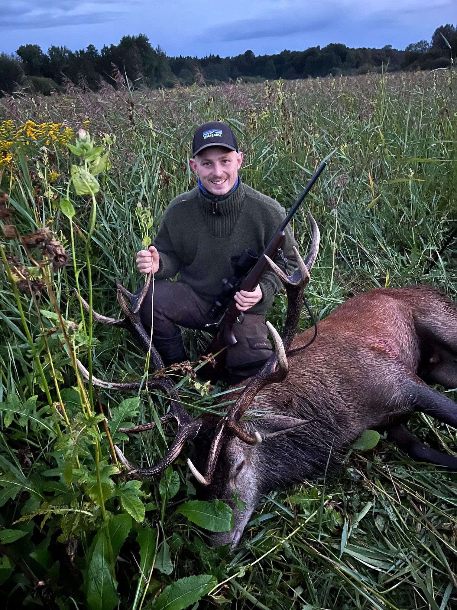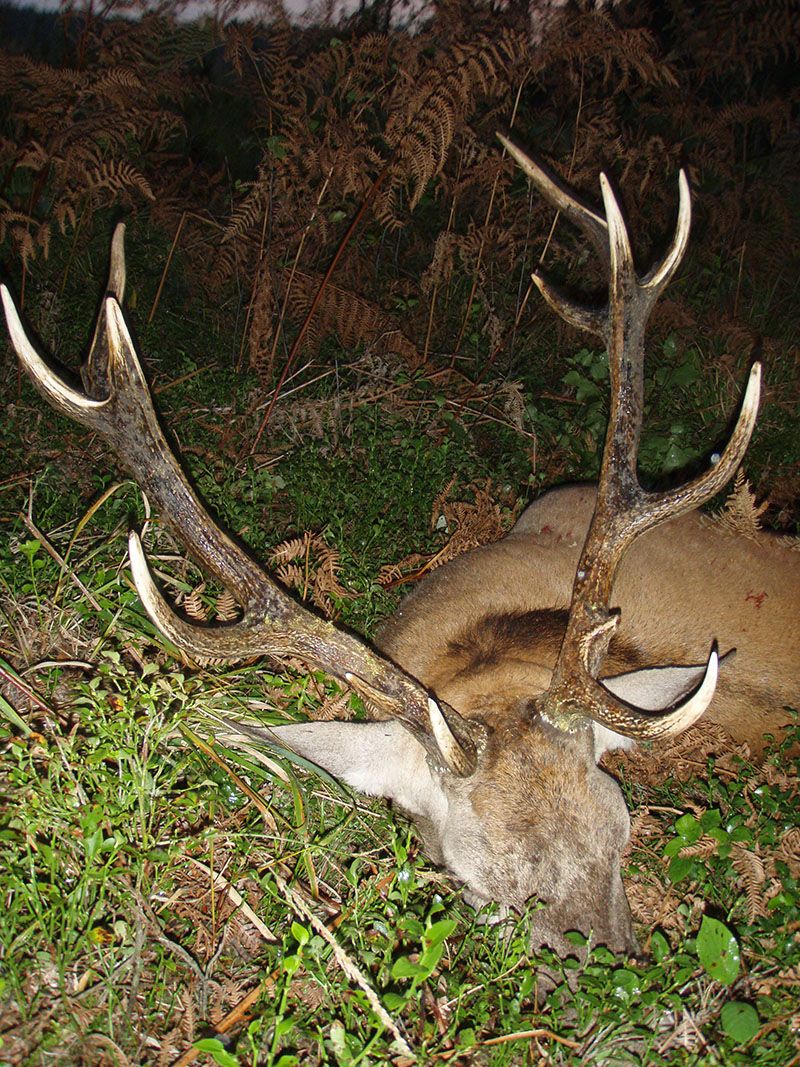 Næste morgen kørte guiden og jeg (jæger) ud til samme sted som vi var aften før, for at se om der ville være hjorte igen og der gik heller ikke langtid før vi hørte dem. Vi gik efter lyden og kunne blive ved med at hører dem, men kunne ikke rigtig se dem da det stadig var halvt mørkt. Vi kom længere ned men kunne stadig ikke se noget og vi blev enige om at de måtte være inde i skoven, så jeg blev enig med min guide om at jeg selv fik lov til at pürch på dem inden i skoven. Jeg gik og på et tidspunkt måtte jeg ned at kravle for at komme igennem noget krat. Jeg var omkring 200 meter inde i skoven da jeg fik øje på en hjort og den stod kun 22 meter fra mig, men den stod med siden til og jeg kunne kun se dens ene stang. Jeg ventede lidt og pludselig stak den hoved og blad frem, og jeg fandt den i min riffelkikkeret og skød et skud på den og den gik ned i første skud! Det var min første hjort og den var 11 år gammel og vejede 6,5 kg.