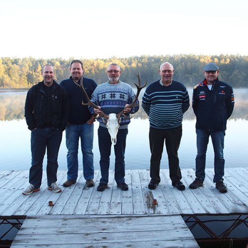 Da vi kom tilbage til huset, stod Poul, nordmænd, samt skytter og ventede. Paradepladsen var tom, så det var med et stort smil at mine 3 dyr blev lagt frem. Det viste sig dog at Poul også, havde haft gang i hans Winchester model 94 (kaliber .307 Win), og fået en kronhind, som allerede var kørt i kølehuset. Den ene af de 2 flinke nordmænd, var kommet til skud, men som han sagde, var det en bommer.