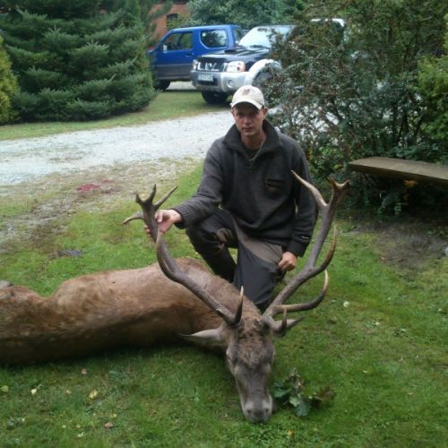 Netop hjemme efter en pragtfuld Hjortejagt på Zamrzenicia med godt gang i brunsten på trods af ekstrem varme. Et højtryk over Polen med dag temperaturen på 25-27° og en dag med 30° var jo ikke ligefrem hvad man havde ønsket, men hjortene lod sig ikke mærke med varmen og brølede ofte allerede ved 17 tiden flere dage. En aften havde vi aftalt at vi ville starte i et tårn og derfra begynde pürsch på den første hjort som brølede, efter 10minutters venten var det afsted, en spændende skov pürsche på ca. 45 minutter hvor vi kommer ind på den brølende hjort som gik i et svært fremkommeligt gammelt grand stykke sammen med et par hinder. Da den endelig stod godt fri i en af rækkerne kunne vi se at det var en ung flot 10ender på ca. 5kg. Jeg havde besluttet mig for en der skulle være lidt større og da der var flere dage tilbage takkede jeg pænt nej til denne hjort og vi listede stille af igen. Næste morgen hørte vi flere hjorte men så ingen, da vi på et tidspunkt er oppe i et tårn for at spotte lidt kommer et vildsvin ud af granderne 100 meter til venstre for os og sikrer ganske kort hvorefter den rask traver ud i det åbne og stopper op en gang for hurtigt at forsvinde i egene på modsatte side, og havde ikke været for en gren med blade som hang ned på siden af tårnet var den nok endt i kølehuset.