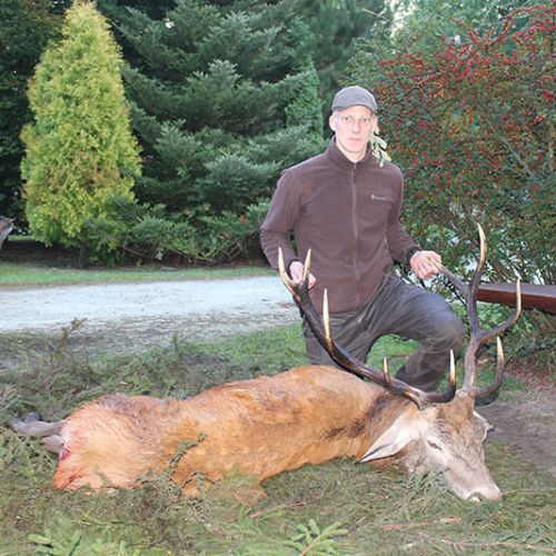 Min umiddelbare vurdering omkring tidspunkt for aktivitet i skoven viser sig heldigvis ikke at holde stik da Wojciech efter blot et kvarters venten puffer til mig og hvisker med friskhed i stemmen, at der kommer en hjort. Ud af ingenting kommer pludselig en hjort travende mod os bag fra, løber næsten forbi på vores højre side. Den stopper 40 meter ude i kanter af de høje fyrrestammer og sikrer ganske kort inden den vil krydse det nyplantede stykke. Mens den står og sikrer, er bladet dækket af et par fyrrestammer men med en klar fornemmelse for hans næste træk er riflen afsikret og hans første skridt bringer ham ud på skovvejen hvor skuddet kommer og han falder for en lidt høj kugle der tager ryggen men som hurtigt suppleres af et fangst skud på halsen.