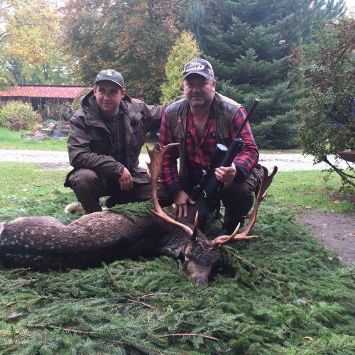 Netop hjemvendt fra en dejlig jagt i Polen på brunst hjort, brunsten udeblev desværre og vi havde dårligt vejr. Skød denne prægtige åhjort efter en lang pursh kom han endelig på scenen , jagtføren spottede ham , jeg kunne ikke se noget som helst i den tætte skov. Jagtføren satte skydestokken klar, jeg lage riflen klar, fikserede et punkt og det punkt kom han ind i, havde valgt at afgive et højt blad skyd og ventede bare han ville komme fra højre. Pludselig passere han træer først geviret så forkroppen og da han stod perfekt stadig halvt dækket af træet sendte jeg missilet afsted.