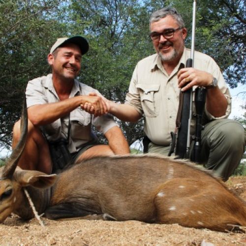 Efter frokost kørte vi ud igen, og ret hurtigt opdagede Pedias en meget ”flot” bushbuck. Efter den obligatoriske afstand på min ½ km. var tilbagelagt, standsede vi bilen og stalkede tilbage efter buschbuck’en. Det lykkedes os inden for kort tid at komme på skudhold af denne, som blev nedlagt i ét skud på ca. 50 m..