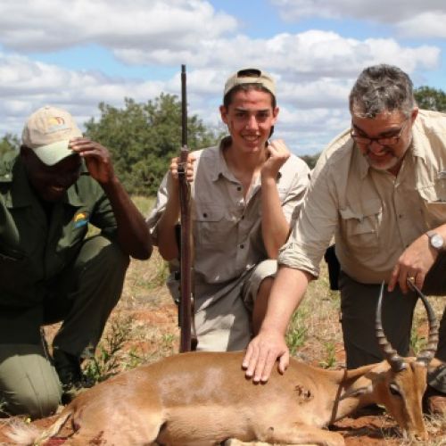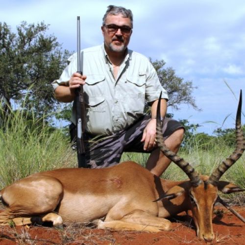 Efter en hurtig morgenmad tirsdag kl. 6 var vi nu klar til Bjørn første egenhændige jagtoplevelse. Efter nogen tids kørsel og stalking kom Bjørn på skudhold af en mindre flok impalaer, i blandt hvilke Bjørn selv kunne vælge sit trofæ. Om det skyldtes nervøsitet eller beskedenhed at Bjørn valgte et mere beskedent trofæ vides ikke, men Bjørn nedlagde en fin mindre impala på ca. 60 m.
