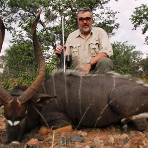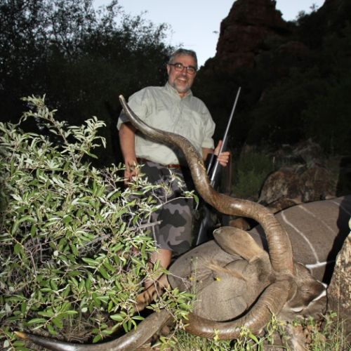 Efter frokost kørte vi ud i terrænet igen. Vi gjorde holdt ved en flodsænkning, som vi fulgte til fods i et par timer. Vi så flere jagtbare trofæer (blandt andet waterbuck og bushbuck), men Mias oplyste hver gang, at vi ville finde bedre trofæer på et senere tidspunkt (hvilket han fik helt ret i). Efter at være kommet op af flodsænkningen gjorde Mias os pludselig opmærksomme på to store kudu tyre, som imidlertid befandt sig ca. 850 m. fra os – på en meget stejl klippeskrænt. Mias foreslog at vi ”gik efter” den største af kudu’erne, hvilket umiddelbart forekom helt umuligt. Men efter 7-8 km. kørsel, mere end en times stalking samt yderligere ca. en times venten var den største af kudu’erne pludselig skudbar – blot et 55 m. lodret skud i liggende stilling ud over en klippeskrænt. Det lykkedes mig imidlertid at nedlægge kudu’en med ét skud lodret gennem ryggen, mens Mias holdt fast i mit venstre ben og Pedias i mit højre ben (så jeg ikke ville falde ud over klippeskrænten). Kudu’en faldt om på stedet, hvorved vi undgik en nærmest umulig forfølgelse på klippeskrænten – samt at trofæet blev beskadiget i fald ned af klippen. En helt utrolig og uforglemmelig jagtoplevelse !