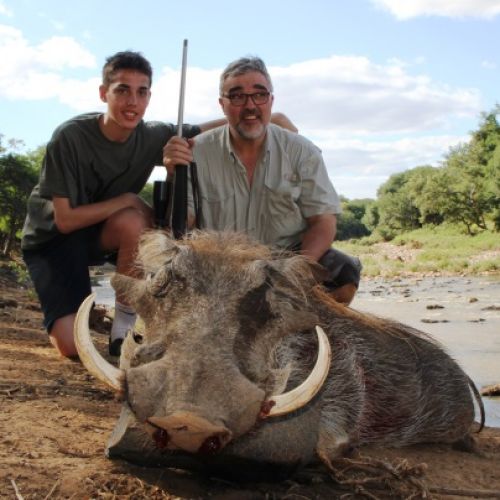 Onsdag morgen blev vi igen vækket, og efter en hurtig morgenmad kl. 6 var vi nu klar igen. Da vi imidlertid allerede nu havde nedlagt 5 ud af de 6 trofæer som var aftalt på forhånd, havde vi ikke længere så ”travlt”, og vi besluttede os derfor på denne dag primært at stalke efter det sidste trofæ: en warthog – eller alternativt en duiker eller en klipspringer. Efter en formiddag fyldt med naturoplevelser (men uden jagtudbytter) og en frokost med fiskeri ved dæmningen nær camp’en (med stort udbytte), startede vi igen efter frokost. Efter ca. 1 times stalking langs en flod, opdagede jeg pludselig en warthog som var ved at svømme over floden. Denne viste sig – efter Mias’ opfattelse – at være et ”skudbart” trofæ, hvorefter jeg nedlagde det i ét skud på den anden side af floden. Herefter fik jeg til opgave at ”kigge efter” og skyde krokodiller (hvis de kom for tæt på), hvorefter Mias og Pedias lagde strømper og sko og vadede over på den anden side af floden og hentede warthog’en. De var begge ”noget” nervøse da de trak den blodige warthog gennem floden på vej tilbage over floden. Igen en helt fantastisk jagtoplevelse !