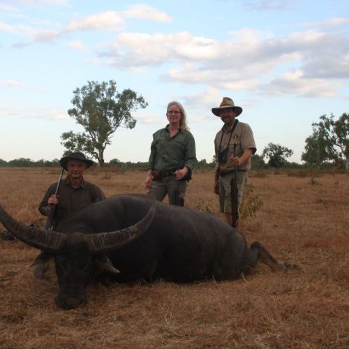 Vi er lige hjemvendte efter en lang sej tur på Vandbøffel jagt i Australien. En tur vi haft på ønskesedlen længe og nu bød lejligheden sig. Graham Wiliams fra Australien Buffalo Hunters leverede varen. Graham er en yderst sympatisk og nærmest pedantisk mand med alting godt forberedt. Efter 2 hårde dage i den Australske bush havde vi begge nedlagt den efterstræbte vandbøffel. Efter nogle lange püsh i det vanskelige og tørre terræn blev begge bøfler nedlagt med de lånte rifler af god kvalitet. Begge bøfler er også af god kvalitet idet begge efter en opmåling i felten ligge lige over de 102 point som er over kravet til guld.