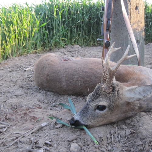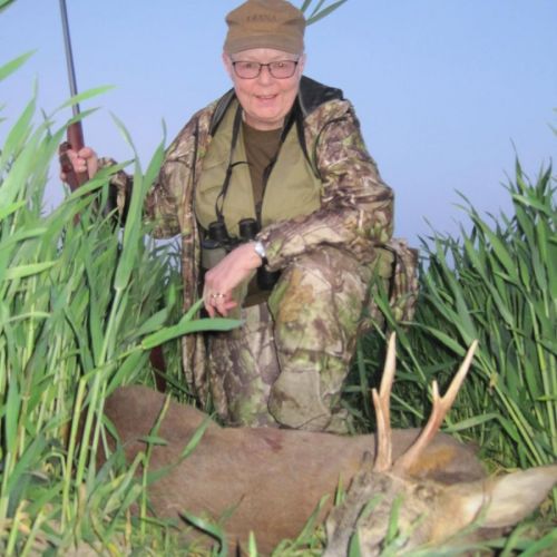 Så er vi hjemme igen efter en rigtig god tur til Maniszewo. Allerede første aften lagde vi ud med hver sin buk og om morgenen fik jeg igen en buk.Jeg havde så nogle jagter hvor der kun var unge bukke men det lover jo godt for næste års jagt. Den 14 om morgenen var vi i en hochstand hvorfra jeg ser en stor keiler løbe væk fra skoven men den var for langt væk så jeg nød synet af den. Efter en stund forlod vi stedet for at komme til en anden hochstand men på vejen ser vi en buk i kanten af marken sammen med en rå,vi stopper og sniger os ud uden at buk og rå opdager os, de går over vejen og i kornet stopper de op og jeg får grønt lys - skyder og bukken springer og forender.
