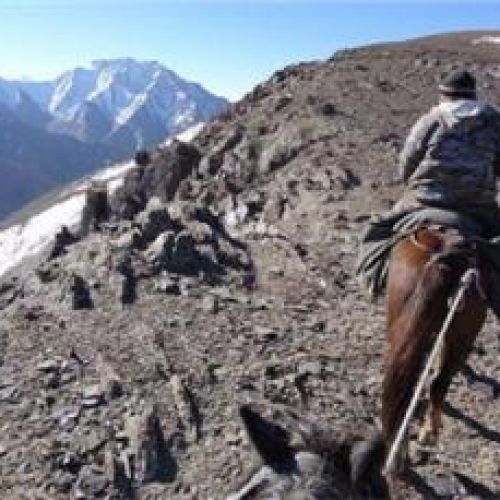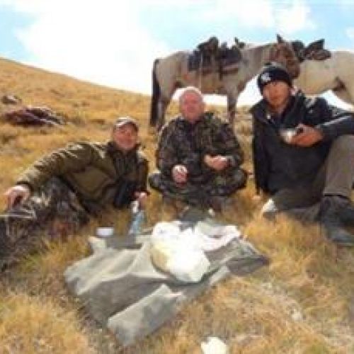 Base Camp laa i 3235 meters hoejde. Foerste dag gik med et kontrolskud om morgenen og en 6-7 timers tur paa hest op i 4.000 meters hoejde. Vi skulle jo lige vaenne os til hoejden og jeg isaer til hesten, da jeg paa naer 2 timers ridning i Mols Bjerge i august, ikke havde siddet paa en hest siden jeg som 8 aarig var i Legoland. Det gik nu rigtigt fint, og hestene var utroligt rolige og meget udholdende. Den dag saa vi MarcoPolo hunner og nogle faa Ibex hunner, og jeg var heldig at se 2 ulve, hvoraf jeg manglede 30 sekunder i at kunne komme til at skyde efter den ene paa 404 meters afstend, men den gled over bakken og var vaek. Vi ville blive beloennet med US$ 300 per ulv vi nedlagde