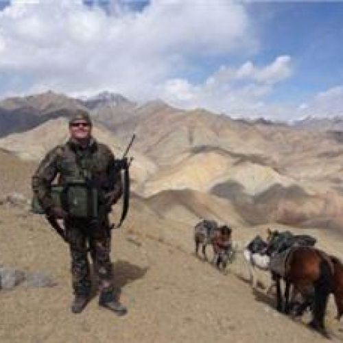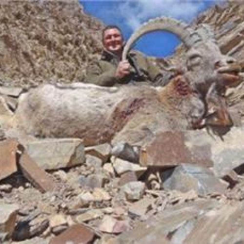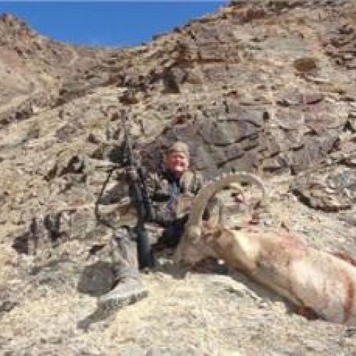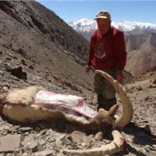 Trediedagen var det saa aabenbart vores alle sammens lykkedag, for vi skoed alle en Ibex den dag viste det sig senere. Jeg spottede min om formiddagen kl 11 paa 465 meters afstand (I 4050 meters hoejde), og vi kravlede derefter ind paa den via nogle nogle stejle klipper, som Ibexen var paa vej til at skulle op paa for at sove til middag. Vi troede vi havde mistet den, men pludselig ser vi den paa 45 meter, og den har set os, saa den loeber afsted men jeg naar at ramme den i det ene bagben inden den smutter vaek. Et minut efter er den naaet 196 meter ned af bjerget, hvor den stiller sig paa en forhoejning, og jeg saetter yderligere 2 skud i den. Foerst et skud der rammer ryggen og derefter et paa bladet, der faar den til at rulle yderligere 40-50 meter ned. Vi tog nogle flotte billeder fra den klippe med sneklaedte kinesiske bjerge i baggrunden og til den anden side kunne vi som en lille prik skimte basecampen 8 km vaek og 800 meter under os. Nu var valget saa at gaa tilbage op til hestene eller ned til Ibexen og derefter hele vejen ned i dalen. Hestene kunne ikke ride den vej. Jeg valgte naturligvis at kravle ned og tage billeder af Ibexen, og derefter ned over skiffer-stenene til vi kunne blive samlet op af hestene. Det gik resten af dagen saa med. Min ibex er 90 centimeter og 9.5 aar gammel.