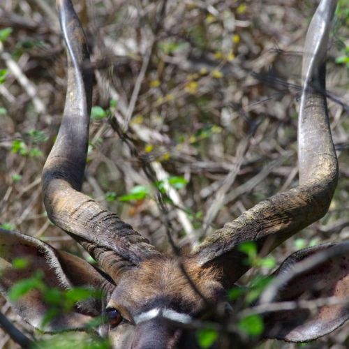 Sekundet senere så jeg den flygtende nyala gennem tæt krat på cirka 30 meters afstand og han så mig! Med et kraftfuldt spring satte han af til siden og løb nu i fuldt firspring væk fra floden med siden til mig. Jeg havde instinktivt kastet riflen til kinden, afsikret den og fulgte nu den springende tyr gennem buskene. Jeg var gået på automatpilot i drivjagt-mode! Lidt længere fremme øjnede jeg en åbning mellem træerne. Da tyren passerede, var min pegefinger tilfreds med inputtet fra kikkerten. Skuddet bragede og ramte nyalaen midt i et spring præcis der, hvor halsen sidder fast på rygraden.