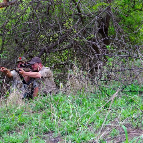Planen var at pursche til tyrene gennem nogle få hundrede meter tæt bush og forhåbentlig finde dem fredeligt græssende på de åbne stykke længere fremme. Hvis vi mødte dyrene på vejen ville den eneste chance være et lynhurtigt skyd på kort afstand i det mørke virvar af grene der tårnede sig op foran os.