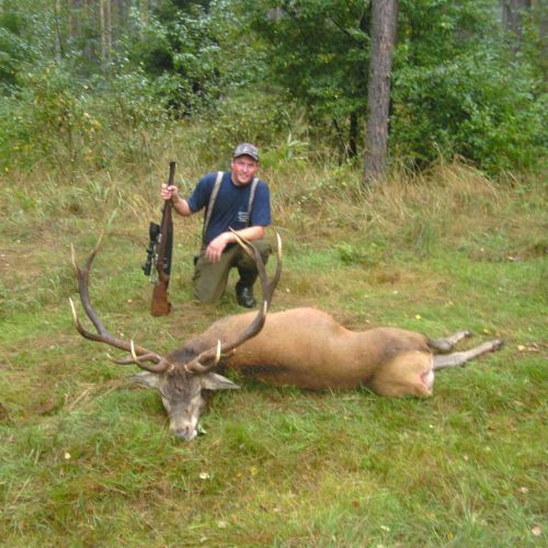 Næste morgen kørte guiden og jeg (jæger) ud til samme sted som vi var aften før, for at se om der ville være hjorte igen og der gik heller ikke langtid før vi hørte dem. Vi gik efter lyden og kunne blive ved med at hører dem, men kunne ikke rigtig se dem da det stadig var halvt mørkt. Vi kom længere ned men kunne stadig ikke se noget og vi blev enige om at de måtte være inde i skoven, så jeg blev enig med min guide om at jeg selv fik lov til at pürch på dem inden i skoven. Jeg gik og på et tidspunkt måtte jeg ned at kravle for at komme igennem noget krat. Jeg var omkring 200 meter inde i skoven da jeg fik øje på en hjort og den stod kun 22 meter fra mig, men den stod med siden til og jeg kunne kun se dens ene stang. Jeg ventede lidt og pludselig stak den hoved og blad frem, og jeg fandt den i min riffelkikkeret og skød et skud på den og den gik ned i første skud! Det var min første hjort og den var 11 år gammel og vejede 6,5 kg.