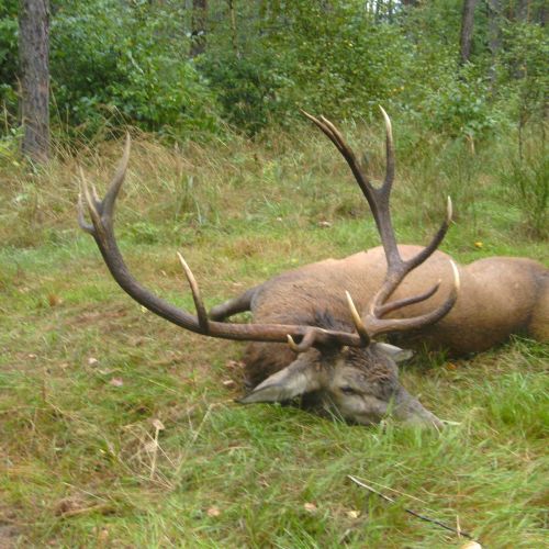 Om aften kørte vi alle 3 ud, hvor vi startede med at sidde i en lille times tid. Derefter kørte vi videre til et sted hvor han mente der ville være hjorte. Vi gik et lille stykke tid inden vi hørte hjortene brøle og da vi begyndt at pürch på dem sprang der pludselig en hind og en kalv ud ca. 10 meter foran os. Vi gik lidt mere og kom ned hvor der stod nogle højspændingsmaster hvor de havde knust et spor. Lidt længere fremme stod der 2 store hjorter + hinder, kalve og bi hjorter. Jeg (ledsager) blev sat af på en skovvej, mens guide og jeg (jæger) gik videre for at pürch på hjortene da vi kom lidt længere ned stod der 1 hjort ude på ca. 170 meter, som guiden mente jeg skulle skyde på, men det blev for mørkt og begyndte at småregne og dyrene trak ind i skoven igen, så vi besluttede at kører tilbage.