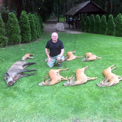 Om aftenen, hvor dagstemperaturen har været omkring de 30 grader, er vi afsted allerede kl. 18.00, men ser ikke råvildt på køreturen. Jeg er klar over, at vi skal hen tæt på solnedgang, før der vil vise sig chancer. Vi sidder nu i en hochsitz i en større lysning i et skovområde. Vi ser er par råer allerede før kl. 20.00 og lidt efter kommer en buk, som løber ind i noget tæt krat. Jeg var bange for at chancen var forpasset, men 20.35 kommer han ud igen, og min jagtleder giver tegn til, at jeg kan skyde. Skuddet falder og dyret forender i knaldet på omkring 100 meter. Igen en pæn seksender, der vurderes til at være 6 år gammel.