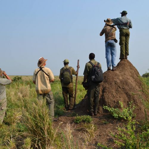 Det var nu min tur til bære riffel, og dagen startede med at vi kørte ud til et træ som blev omtalt som bøffel træet. Der kravlede 2 lokale sporer op i træet, for at ser efter dagga boys, de kom dog først ned efter en halv times tid, da der hang en tæt dis over sumpen, et tegn på at det skulle blive en meget varm dag. Sporerne har spottet 2 dagga boys et stykke ude i sumpen, men på et tørt område.