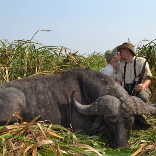 Vi nåede forbi de værste siv, og kom til et område med mere spredt siv bevoksning, og der var også fast grund under fødderne. Vi pürschede videre, og kunne pludselig se en bøffel, der gik græssende, 60-70 m fra os, op med skydestokken, og rifflen op, Sakkie snakkede stille og roligt, til mig, bare tag dig godt tid, jeg pustede langsomt ud, og skød første skud, bøflen satte i løb, skråt hen forbi os, jeg repeterede og skød 2. skud, jeg kunne også høre dette skuds anslag, jeg repeterede igen, fandt bøflen i kikkerten, men den var nu inden i noget langt siv, ca. 25 meter væk, jeg kunne kun se den i glimt, men jeg lod 3. skud gå, og så var den væk.