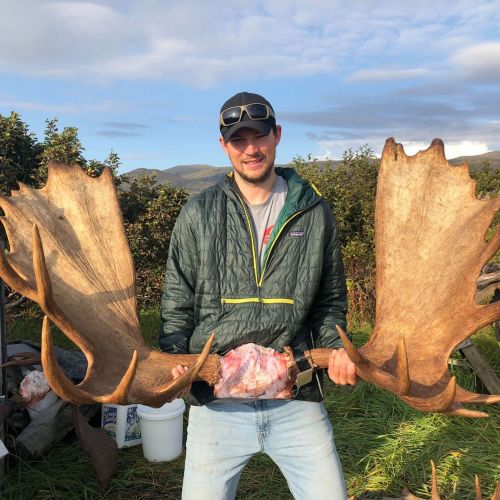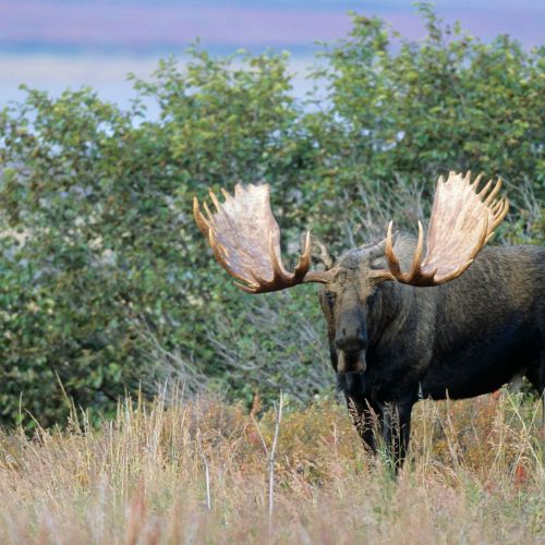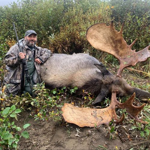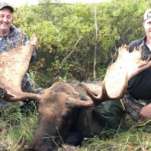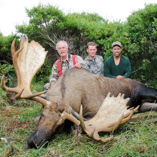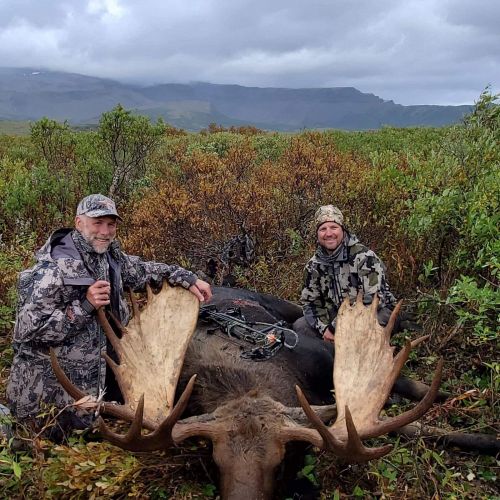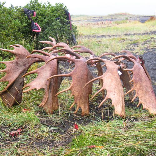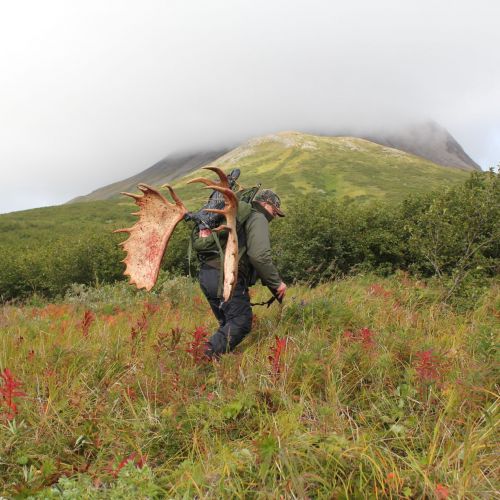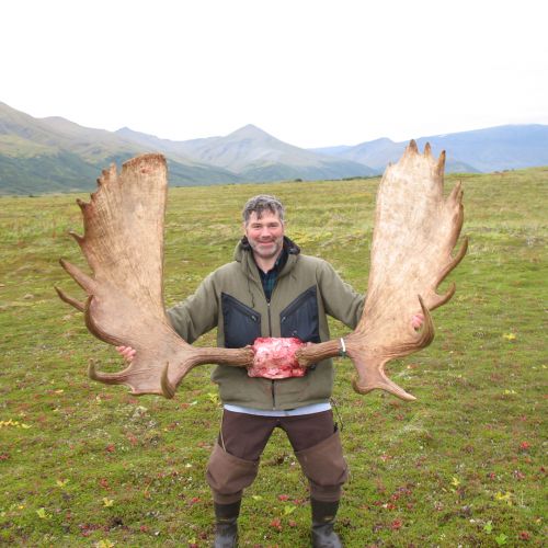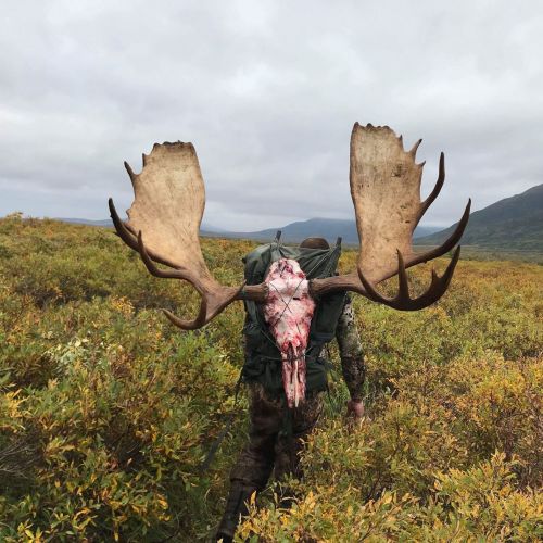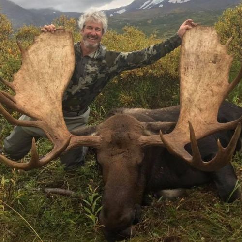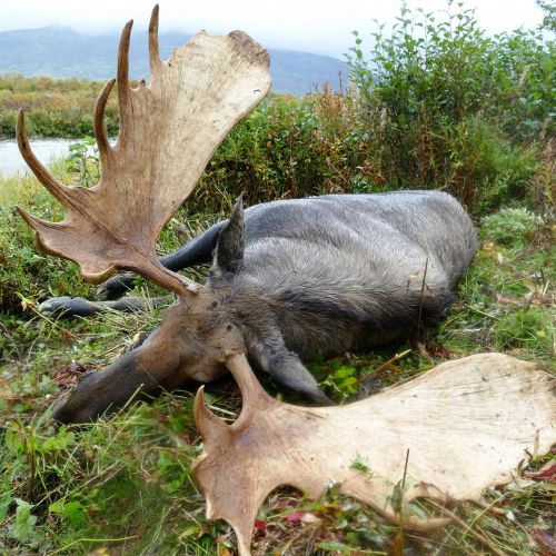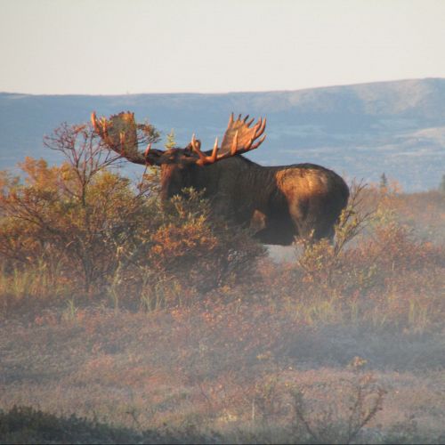 Alaska Älgarna kommer i genomsnitt upp i 60-65" tum och 70 " tum är inte helt ovanligt, stora skovel horn med många taggar är det jägarna letar efter. Under september är Älgarna i brunst och mycket aktiva, kikarspaning och lockjakt är det effektivaste jakt metoderna. Jägarna flygs ut i dalgångarna från huvudcampen och bor i primitiva traditionella Alaska tältläger med den modernaste utrustningen. Därifrån jagar du och din guide i skuggan av vulkaner och spektakulära berg och floder, bäckar som på höstarna vimlar med lax, som utgör den största vilda lax uppgången på jorden.