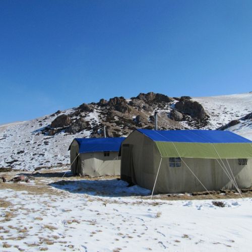 Normalt brukar första och sista natten ske i baslägret, som oftast består av jurter/gers. Jaktstugor eller tält. I dessa läger är det inte några moderna faciliteter, det är dock möjlighet till bad/dusch. Generellt är de rena, trivsamma och varma. I dessa läger finns både en kock och en tolk. Under själva jakten bor man mycket asketiskt och primitivt i ett litet tält, och av och till i klippgrottor.