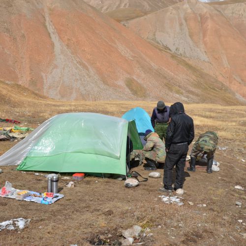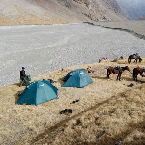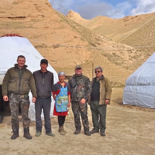 Under jakten bor man beroende av jaktområde antingen i läger uppbyggt av mobila husvagnar i hytter av trä eller i de traditionella jurter (kirgiziska runda tält, som man hittar på många ställen i Asien, tillexempel också i Mongoliet). Tälten är uppvärmda med kamin och ganska komfortabla. Under själva jakten får man vara inställd på att man från och till bor i mycket primitiva tält eller i grottor. Det är därför viktigt att man tar med en riktigt bra sovsäck och ett liggunder.