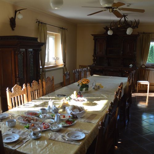 Boende sker i jakthuset i jaktområdet, varifrån man kan höra hjortarna bröla precis utanför huset under kronhjortens brunst i september. Gästdelen på plan 1 innehåller 1 enkelrum, 4 dubbelrum, 3 st 3-bäddsrum och 1 4-bäddsrum. Det finns ett kylskåp till våra gästers förfogande. På bottenvåningen finns ett mysigt vardagsrum med öppen spis och en matsal. Det finns tillgång till låst garage och kylförråd. Jaktledaren heter Franciszek Matysiak, och han talar lite tyska. Han och hans jaktguider är oerhört professionella och omtyckta bland våra kunder. Det finns Wi-Fi och mobiltäckning.