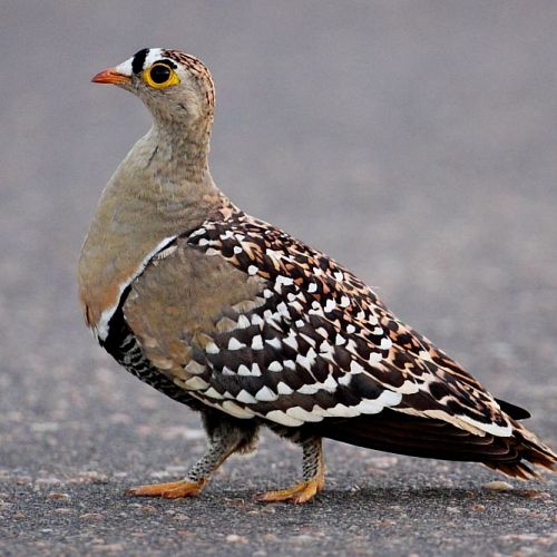 Beskrivning: Double-banded sandgrouse är i storlek som en duva. Och fjäderdräkten är ljusbrun med mörka ränder och vita prickar . Hanen skiljer sig med att ha ett iögonfallande svart och vitt band på pannan och ett kastanjefärgat halsområde avgränsat av ett annat svart och vitt band. Ögonen är omgivna av ett gult band och näbbet är orange.