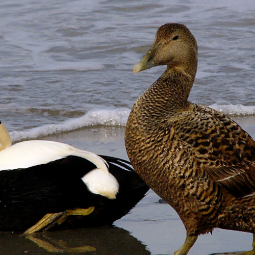 Beskrivning: Ejderfåglar är stora havsfåglar med en karakteristisk yttre dun, känt som dun, som de använder för att isolera sig från kylan. Hanen har en svartvit fjäderdräkt, medan honan har en mer dämpad brunaktig fjäderdräkt.