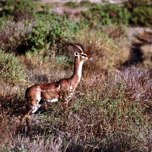 Beskrivning: Vacker rödbrun gasell med karaktäristisk lång hals, som har givit namnet giraffgasell. Giraffgasellen väger ca 35-50 kg och mäter ca 100 cm över manken.